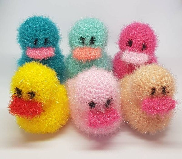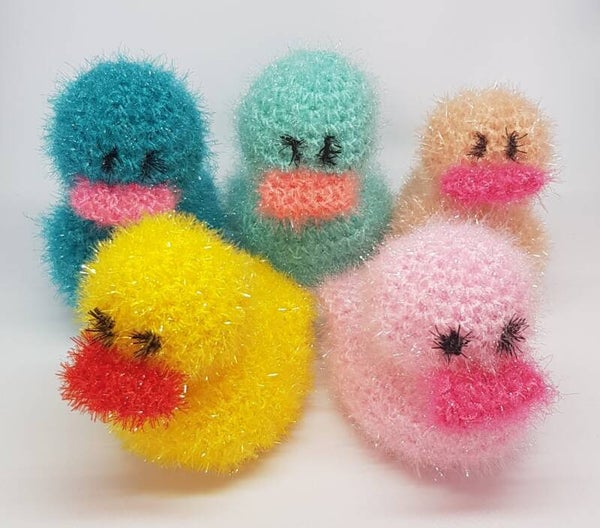 Vrolijke badeendjes in diverse kleuren. Deze eendjes kunnen écht mee in bad of onder de douche! Het garen is daar speciaal voor gemaakt en de eendjes zijn gevuld met een klein stukje van een douche puff dus ook de vulling is geschikt voor water. Door deze materialen zijn zowel het garen als de puff weer heel snel droog!